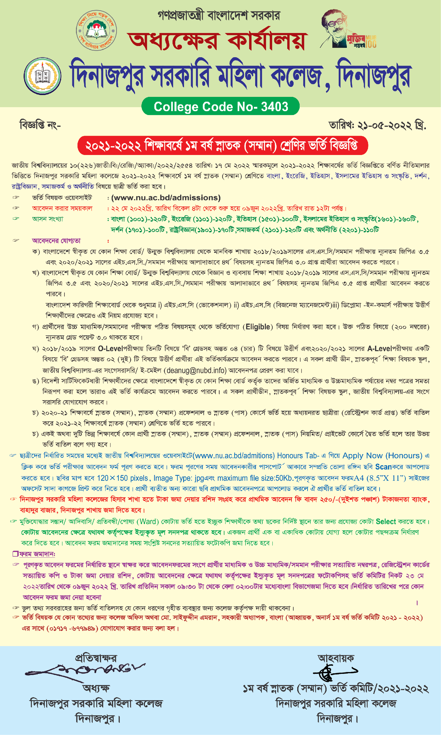 ২০২১-২০২২ শিক্ষাবর্ষে অনার্স ১ম বর্ষে ভর্তি বিজ্ঞপ্তি